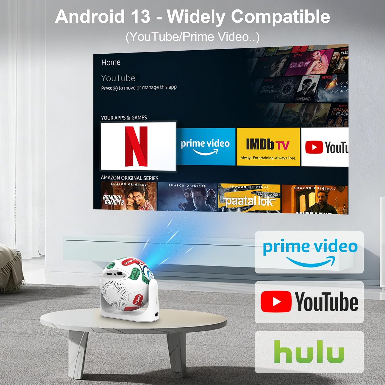 【Built-in Apps & Versatile Connectivity】 This smart projector features Android 13—no extra devices needed, simply connect to Wi-Fi for easy access to a vast library of entertainment resources—movies, TV shows, and apps. Equipped with HDMI, USB, and audio ports, it seamlessly pairs with game consoles, USB drives, laptops, and more, making it ideal for home entertainment, outdoor projection, and office presentations