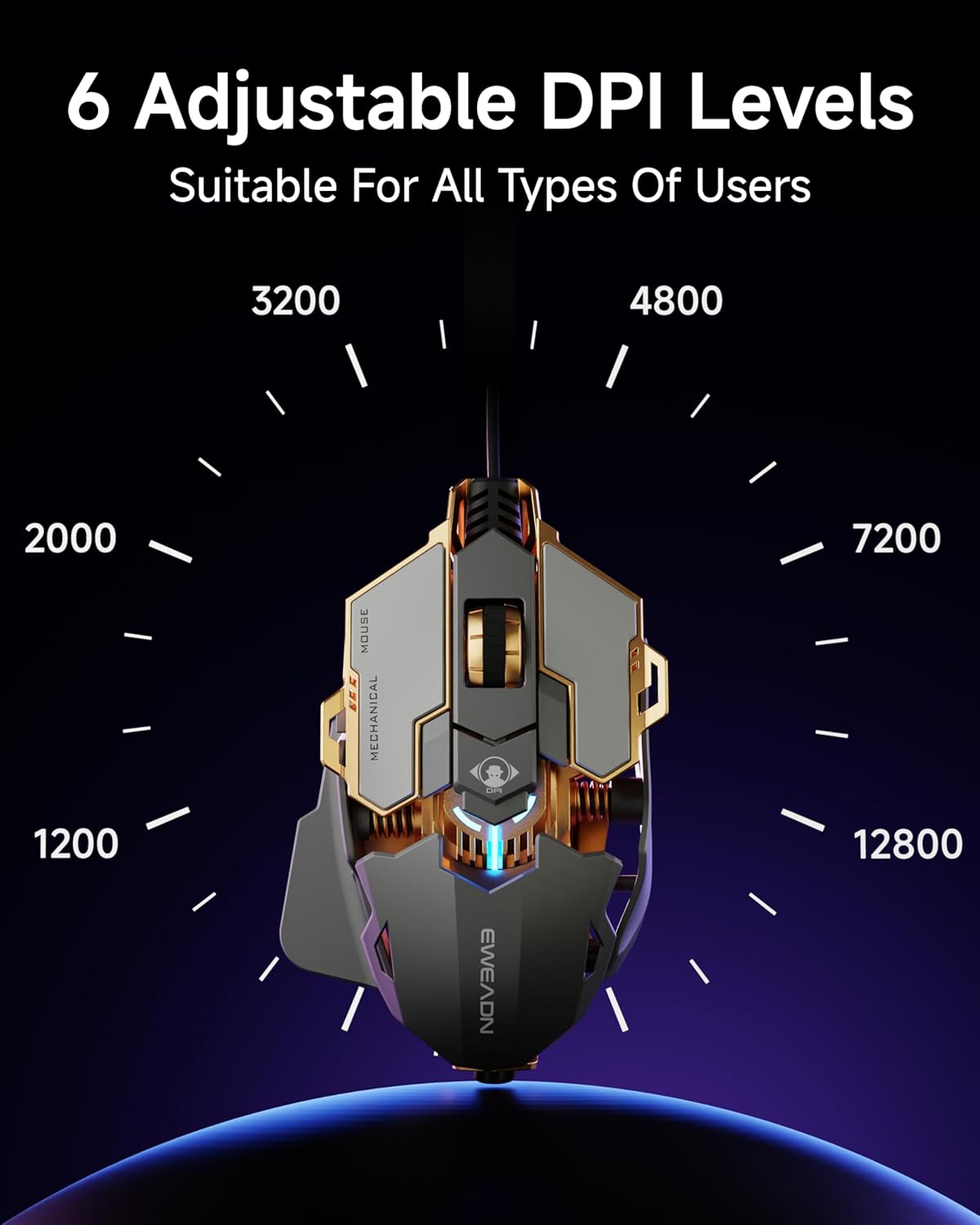 6-Level Adjustable DPI: The EWEADN G5 computer mouse features up to 12,800 DPI with 6 adjustable levels and an ultra-fast report rate (125–1000Hz), meeting your multiple needs, either for daily work or gaming. Dedicated demand for DPI options between 2000-12800 is available to be processed by software.