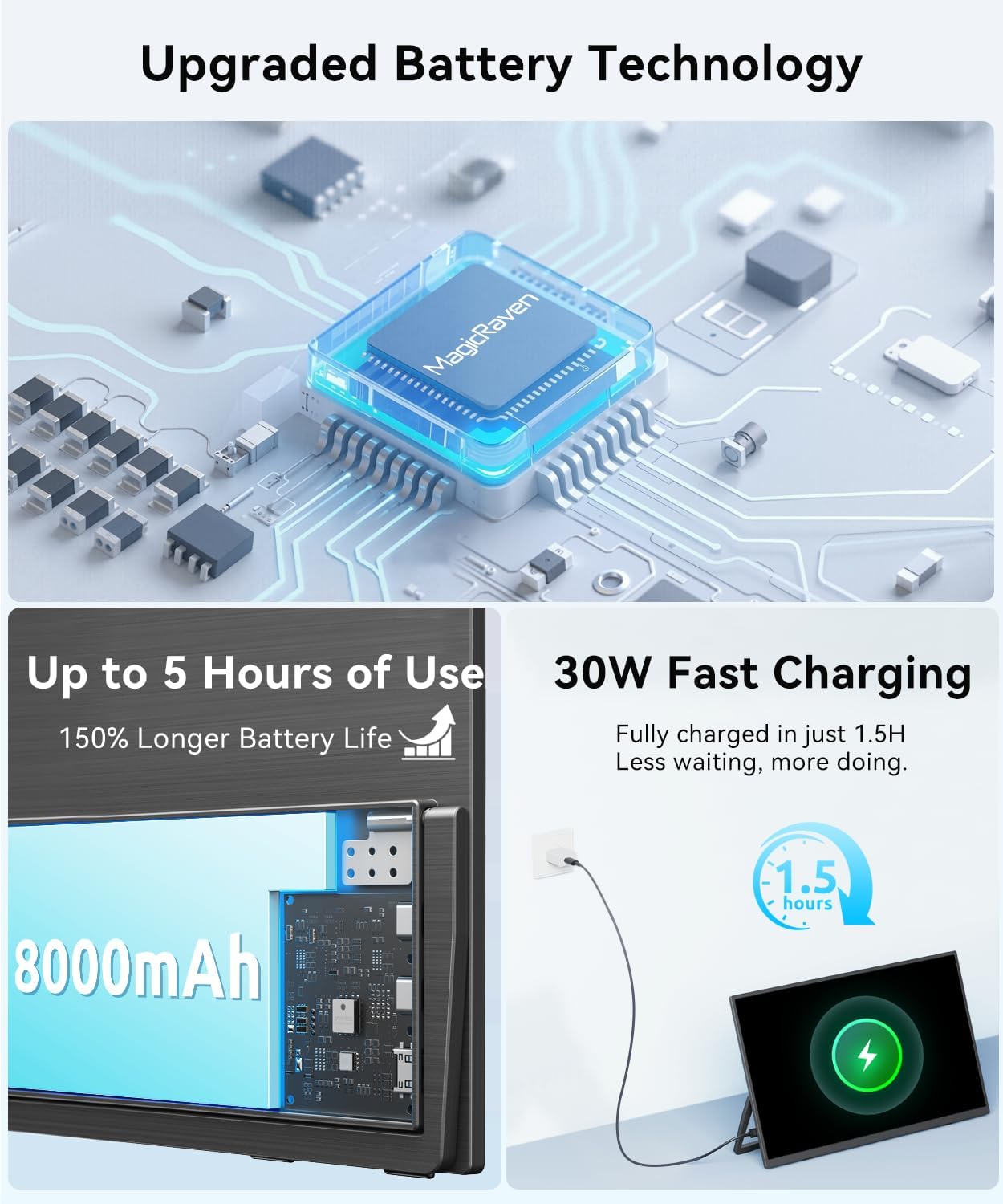Built-in 8000mAh Battery – Work Anywhere: The latest battery technology with up to 5 hours of runtime. It also supports charging from power banks, so wall outlets never limit you. A truly battery-powered portable monitor designed for travel, coffee shops, meetings, and remote work